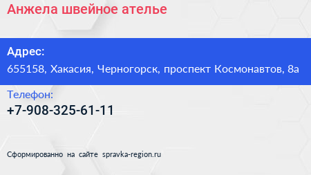 Анжела, швейное ателье по адресу 655158, Хакасия, Черногорск, проспект Космонавтов, 8а в дальнейшем Организация, размещена в следующих категориях: