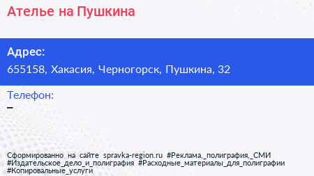 Ателье на Пушкина по адресу 655158, Хакасия, Черногорск, Пушкина, 32 в дальнейшем Организация, размещена в следующих категориях: