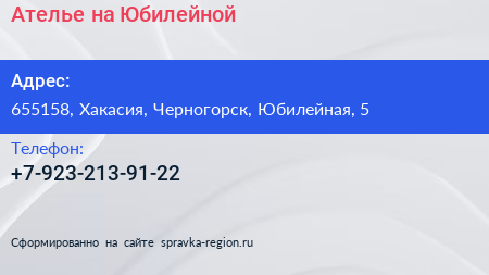 Ателье на Юбилейной по адресу 655158, Хакасия, Черногорск, Юбилейная, 5 в дальнейшем Организация, размещена в следующих категориях: