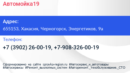 Автомойка19 по адресу 655153, Хакасия, Черногорск, Энергетиков, 9а в дальнейшем Организация, размещена в следующих категориях: