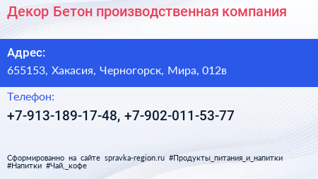 Декор Бетон, производственная компания по адресу 655153, Хакасия, Черногорск, Мира, 012в в дальнейшем Организация, размещена в следующих категориях: