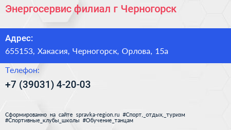 Энергосервис, филиал г. Черногорск по адресу 655153, Хакасия, Черногорск, Орлова, 15а в дальнейшем Организация, размещена в следующих категориях: