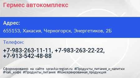 Гермес, автокомплекс по адресу 655153, Хакасия, Черногорск, Энергетиков, 2Б в дальнейшем Организация, размещена в следующих категориях: