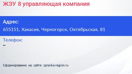 ЖЭУ-8, управляющая компания по адресу 655151, Хакасия, Черногорск, Октябрьская, 81 в дальнейшем Организация, размещена в следующих категориях: