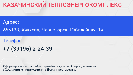 КАЗАЧИНСКИЙ ТЕПЛОЭНЕРГОКОМПЛЕКС по адресу 655138, Хакасия, Черногорск, Юбилейная, 1а в дальнейшем Организация, размещена в следующих категориях:
