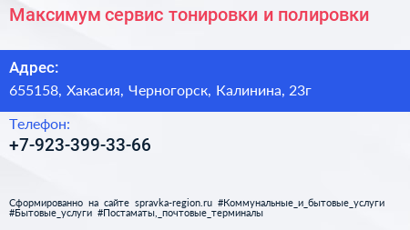 Максимум, сервис тонировки и полировки по адресу 655158, Хакасия, Черногорск, Калинина, 23г в дальнейшем Организация, размещена в следующих категориях: