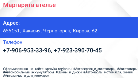 Маргарита, ателье по адресу 655151, Хакасия, Черногорск, Кирова, 62 в дальнейшем Организация, размещена в следующих категориях: