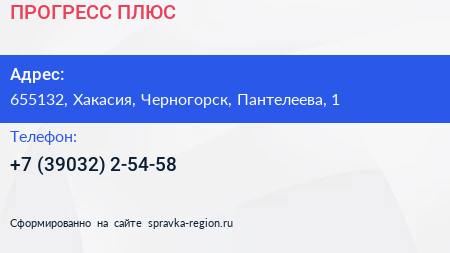ПРОГРЕСС-ПЛЮС по адресу 655132, Хакасия, Черногорск, Пантелеева, 1 в дальнейшем Организация, размещена в следующих категориях: