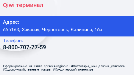 Qiwi, терминал по адресу 655163, Хакасия, Черногорск, Калинина, 16а в дальнейшем Организация, размещена в следующих категориях: