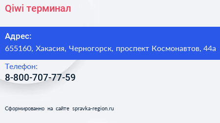 Qiwi, терминал по адресу 655160, Хакасия, Черногорск, проспект Космонавтов, 44а в дальнейшем Организация, размещена в следующих категориях: