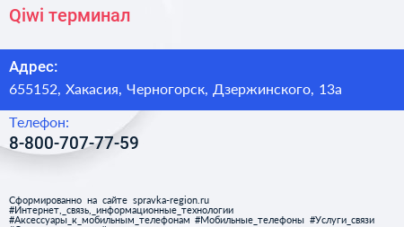 Qiwi, терминал по адресу 655152, Хакасия, Черногорск, Дзержинского, 13а в дальнейшем Организация, размещена в следующих категориях: