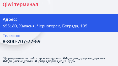 Qiwi, терминал по адресу 655160, Хакасия, Черногорск, Бограда, 105 в дальнейшем Организация, размещена в следующих категориях: