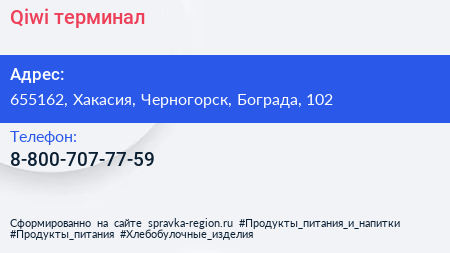 Qiwi, терминал по адресу 655162, Хакасия, Черногорск, Бограда, 102 в дальнейшем Организация, размещена в следующих категориях: