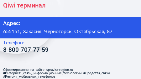 Qiwi, терминал по адресу 655151, Хакасия, Черногорск, Октябрьская, 87 в дальнейшем Организация, размещена в следующих категориях: