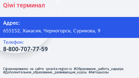 Qiwi, терминал по адресу 655152, Хакасия, Черногорск, Сурикова, 9 в дальнейшем Организация, размещена в следующих категориях: