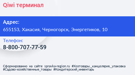 Qiwi, терминал по адресу 655153, Хакасия, Черногорск, Энергетиков, 10 в дальнейшем Организация, размещена в следующих категориях: