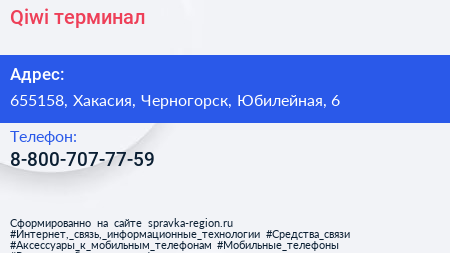 Qiwi, терминал по адресу 655158, Хакасия, Черногорск, Юбилейная, 6 в дальнейшем Организация, размещена в следующих категориях: