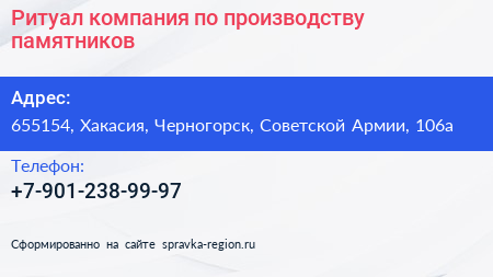 Ритуал, компания по производству памятников по адресу 655154, Хакасия, Черногорск, Советской Армии, 106а в дальнейшем Организация, размещена в следующих категориях: