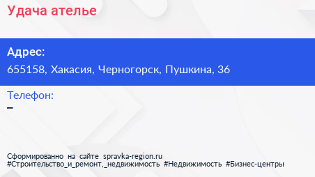 Удача, ателье по адресу 655158, Хакасия, Черногорск, Пушкина, 36 в дальнейшем Организация, размещена в следующих категориях: