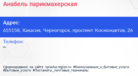 Анабель, парикмахерская по адресу 655158, Хакасия, Черногорск, проспект Космонавтов, 26 в дальнейшем Организация, размещена в следующих категориях: