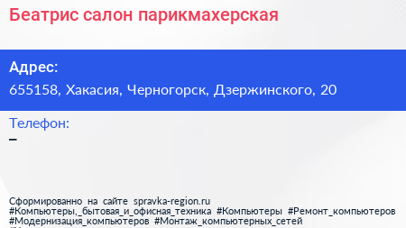 Беатрис, салон-парикмахерская по адресу 655158, Хакасия, Черногорск, Дзержинского, 20 в дальнейшем Организация, размещена в следующих категориях: