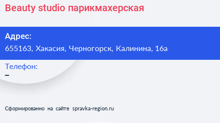 Beauty studio, парикмахерская по адресу 655163, Хакасия, Черногорск, Калинина, 16а в дальнейшем Организация, размещена в следующих категориях: