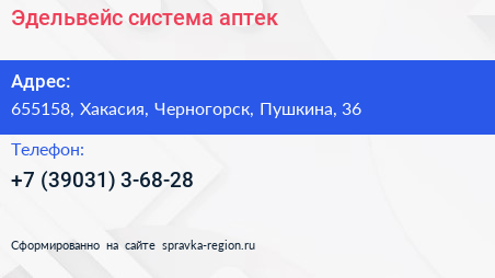 Эдельвейс, система аптек по адресу 655158, Хакасия, Черногорск, Пушкина, 36 в дальнейшем Организация, размещена в следующих категориях: