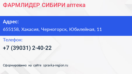 ФАРМЛИДЕР СИБИРИ, аптека по адресу 655158, Хакасия, Черногорск, Юбилейная, 11 в дальнейшем Организация, размещена в следующих категориях: