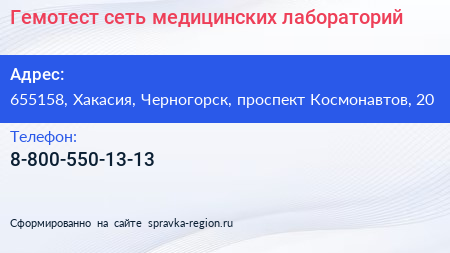 Гемотест, сеть медицинских лабораторий по адресу 655158, Хакасия, Черногорск, проспект Космонавтов, 20 в дальнейшем Организация, размещена в следующих категориях: