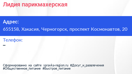 Лидия, парикмахерская по адресу 655158, Хакасия, Черногорск, проспект Космонавтов, 20 в дальнейшем Организация, размещена в следующих категориях: