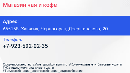 Магазин чая и кофе по адресу 655158, Хакасия, Черногорск, Дзержинского, 20 в дальнейшем Организация, размещена в следующих категориях: