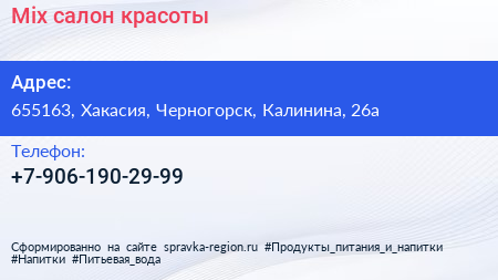Mix, салон красоты по адресу 655163, Хакасия, Черногорск, Калинина, 26а в дальнейшем Организация, размещена в следующих категориях: