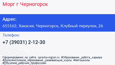 Морг, г. Черногорск по адресу 655162, Хакасия, Черногорск, Клубный переулок, 26 в дальнейшем Организация, размещена в следующих категориях: