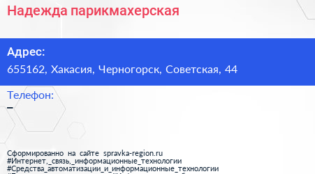 Надежда, парикмахерская по адресу 655162, Хакасия, Черногорск, Советская, 44 в дальнейшем Организация, размещена в следующих категориях: