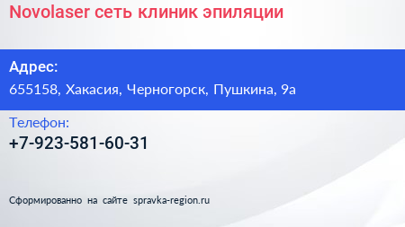 Novolaser, сеть клиник эпиляции по адресу 655158, Хакасия, Черногорск, Пушкина, 9а в дальнейшем Организация, размещена в следующих категориях: