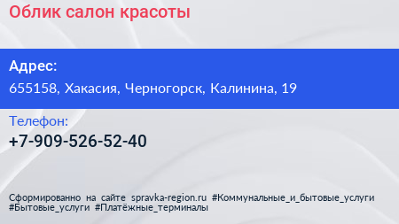 Облик, салон красоты по адресу 655158, Хакасия, Черногорск, Калинина, 19 в дальнейшем Организация, размещена в следующих категориях: