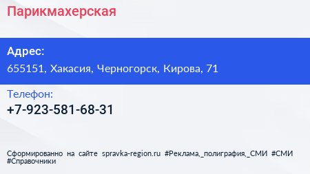 Парикмахерская по адресу 655151, Хакасия, Черногорск, Кирова, 71 в дальнейшем Организация, размещена в следующих категориях: