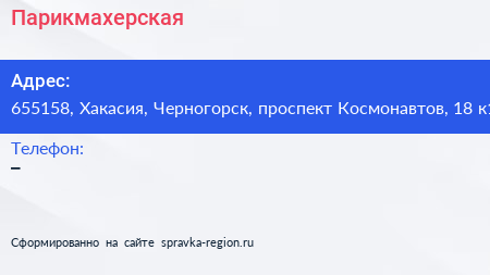 Парикмахерская по адресу 655158, Хакасия, Черногорск, проспект Космонавтов, 18 к1 в дальнейшем Организация, размещена в следующих категориях: