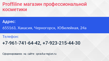 Proffiline, магазин профессиональной косметики по адресу 655163, Хакасия, Черногорск, Юбилейная, 24а в дальнейшем Организация, размещена в следующих категориях: