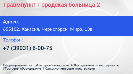 Травмпункт, Городская больница №2 по адресу 655162, Хакасия, Черногорск, Мира, 13в в дальнейшем Организация, размещена в следующих категориях: