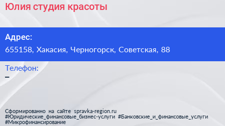 Юлия, студия красоты по адресу 655158, Хакасия, Черногорск, Советская, 88 в дальнейшем Организация, размещена в следующих категориях: