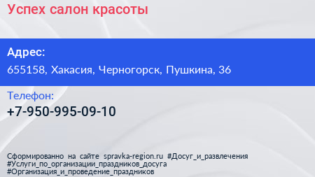 Успех, салон красоты по адресу 655158, Хакасия, Черногорск, Пушкина, 36 в дальнейшем Организация, размещена в следующих категориях: