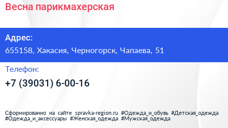 Весна, парикмахерская по адресу 655158, Хакасия, Черногорск, Чапаева, 51 в дальнейшем Организация, размещена в следующих категориях: