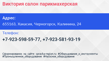 Виктория, салон-парикмахерская по адресу 655163, Хакасия, Черногорск, Калинина, 24 в дальнейшем Организация, размещена в следующих категориях:
