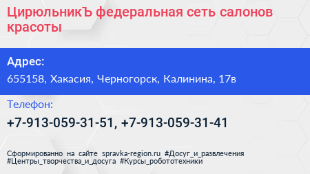 ЦирюльникЪ, федеральная сеть салонов красоты по адресу 655158, Хакасия, Черногорск, Калинина, 17в в дальнейшем Организация, размещена в следующих категориях: