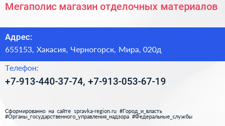 Мегаполис, магазин отделочных материалов по адресу 655153, Хакасия, Черногорск, Мира, 020д в дальнейшем Организация, размещена в следующих категориях: