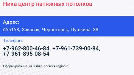 Ника, центр натяжных потолков по адресу 655158, Хакасия, Черногорск, Пушкина, 38 в дальнейшем Организация, размещена в следующих категориях: