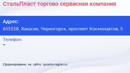СтальПласт, торгово-сервисная компания по адресу 655158, Хакасия, Черногорск, проспект Космонавтов, 5 в дальнейшем Организация, размещена в следующих категориях: