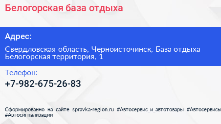 Белогорская, база отдыха по адресу Свердловская область, Черноисточинск, База отдыха Белогорская территория, 1 в дальнейшем Организация, размещена в следующих категориях:
