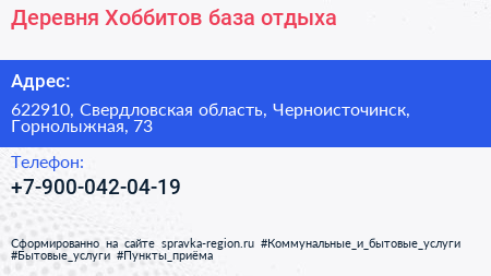 Деревня Хоббитов, база отдыха по адресу 622910, Свердловская область, Черноисточинск, Горнолыжная, 73 в дальнейшем Организация, размещена в следующих категориях:
